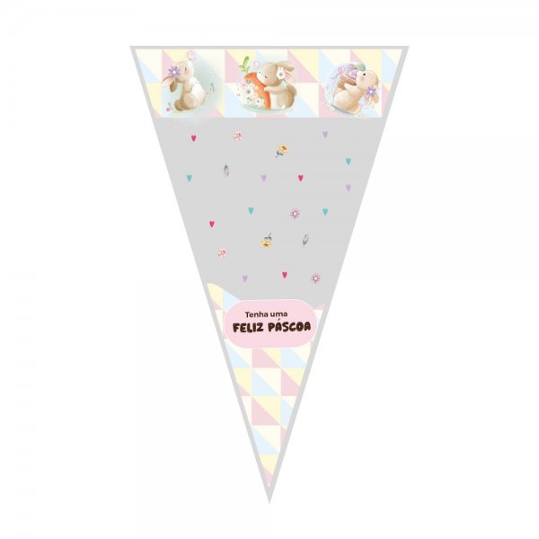 Saco Plástico Poli Transparente Decorado em formato de cone 18x30cm, destinado para embalar de forma fácil e rápida, alimentos, doces, chocolates e mais. Esta medida em especial é muito utilizada em festas como também na Páscoa para embalar chocolates, balas, pirulitos, doces, devido a sua versatilidade.