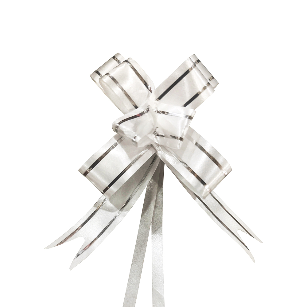 Laço de Armar Branco com Filete Prata é um produto muito prático, fácil de montar, basta puxar levemente os fitilhos centrais mantendo a fita estática com a outra mão para ele armar o laço e assim já estará pronto para enfeitar presentes, cestas, kits, lembrancinhas e mais