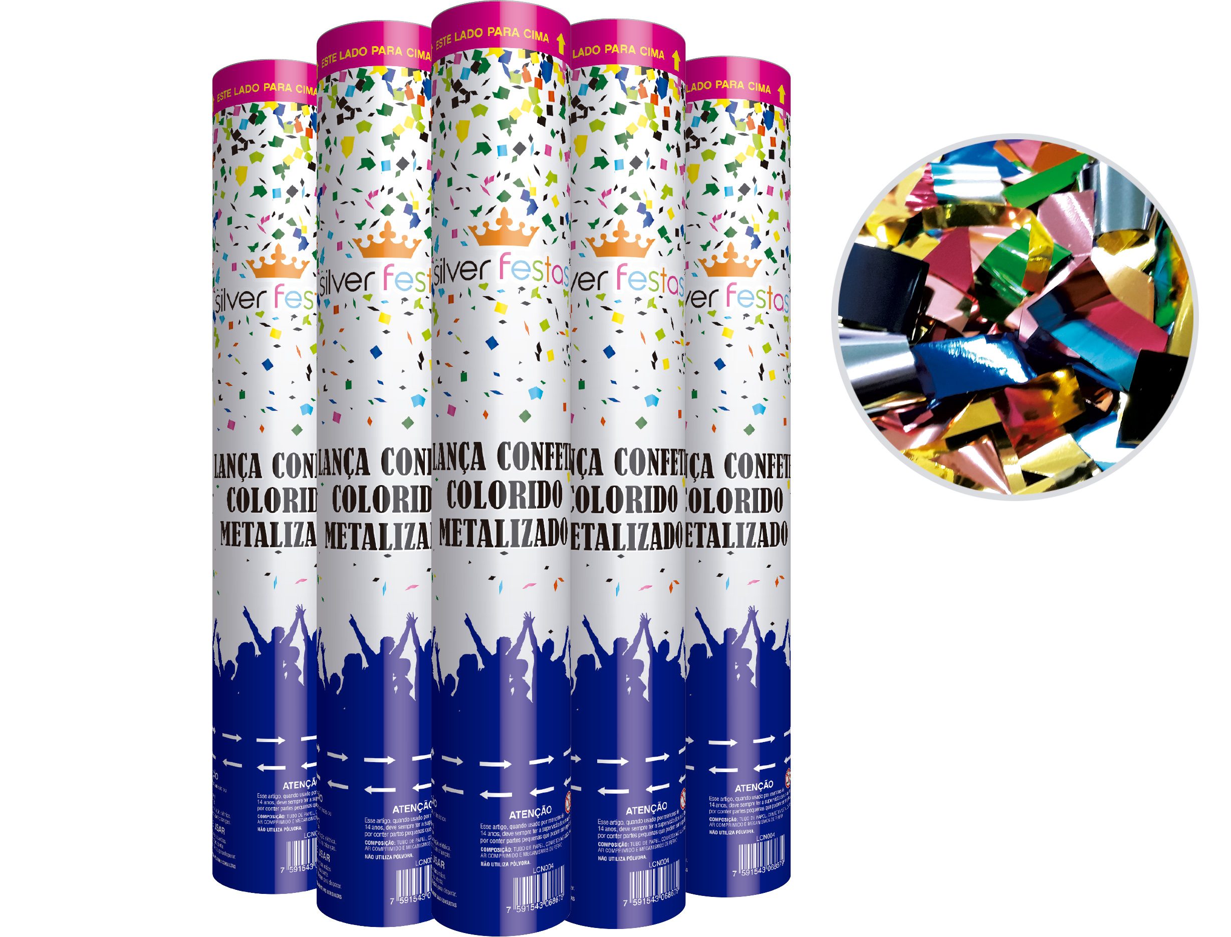 COMPOSIÇÃO: Tubo de Papel, confetes metalizados, ar comprimido e mecanismo de ferro. NÃO UTILIZA POLVORA